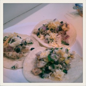 - over corn tortilla, spoon fish, salsa, and anything else you want into your taco.