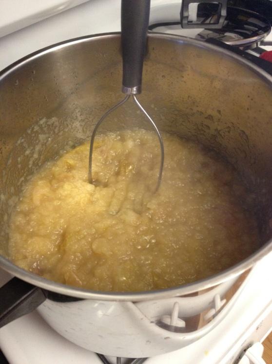 - Mash apples and turn off heat. After 2 hours, most of the apples are soft enough to mash up with a wooden spoon or potato masher. After mashing, we have applesauce (with the peel of course)!