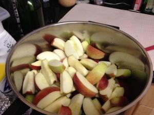 - Set stove to medium-low for about 2 hours, covered with lid. During those 2 hours, give it a few stirs as the apples tend to stick to the bottom a bit. You can add some apple juice or cider to prevent sticking. If you’d rather cook it longer on a lower heat, you can do that too.
