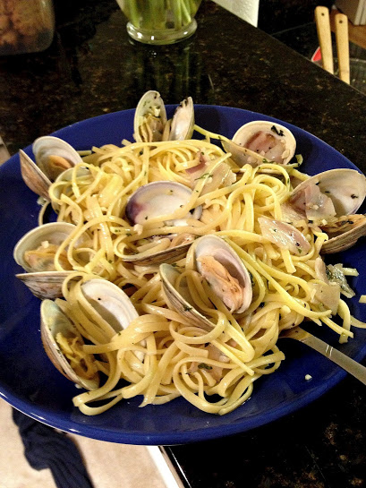 In my attempt to duplicate it, I turned to The Great Stanley Tucci, and his most amazing cookbook.  Besides trying to figure out how to kill the little clams — they are alive before you cook them-WHOA — this is one of the easiest dishes I have ever made.  It takes no more than 30 minutes.  But I do recommend a kitchen slave helper.  Luckily, my personal chef was ready to assist me.