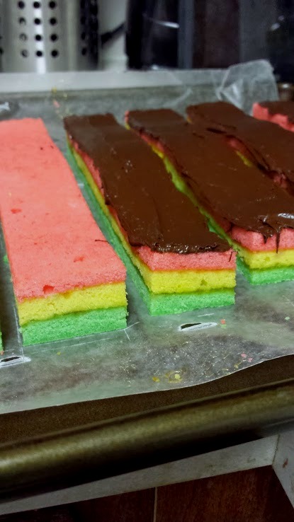 - When all layers are cool, invert green onto a wax-paper-lined large baking sheet. Discard paper from layer and spread with black raspberry preserves. Invert yellow on top of green layer, discarding paper. Spread with apricot preserves. Invert red layer on top of yellow layer and discard wax paper.