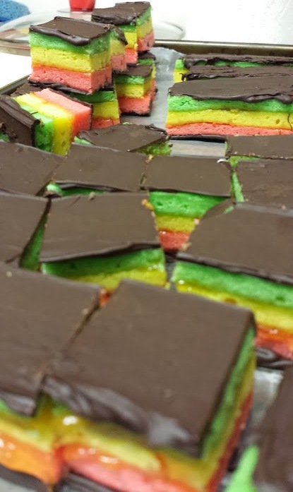 - Trim edges of assembled layers with a long serrated knife, slice assembled layer into thin strips, about 1” thick. Note: this is way way easier when frozen