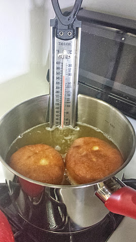 - Pour enough oil into a fryer or large pot to fill a 2-inch depth. Heat to 350°F. Fry donuts a few at a time (4-5), until golden brown on both sides, about 1-2 minutes per side. Using a slotted spoon, place donuts on a rack lined with paper towels. Repeat until all donuts have been fried. Let donuts come to room temperature before filling and glazing.